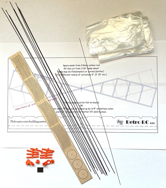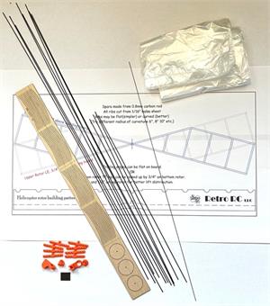 Kit contains enough materials to make four off two bladed rotors for the SciOly helicopters:8 off 0.8mm x 15" Carbon Rods4 off 0.8mm x 9" Carbon Rods0.020" x 12" music wire for prop shafts & rear hooks48 off Laser cut balsa ribs3 dime size balsa discs2 sets of 4 Rotor hubs6 micron thisk plastic covering material (use 3M77 spray glue to attach to rotor.2 off Hanger loop and thrust button sets6 off Thrust washersThis kit does not contain a Plan or Building Jig, it is intended for the more experienced builder to experiament with their own designs or build from a downloaded plan from the internet.